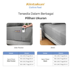 Sprei Cotton Feel hadir dalam dua pilihan: Side Pocket dan Basic, dengan tekstur lembut ala katun yang enak di kulit. Pilihan warnanya polos dan modern, mudah dipadukan dengan berbagai gaya kamar, dari yang minimalis sampai kontemporer. Keduanya dilengkapi double karet anti geser serta tinggi 30 cm agar tetap rapi di kasur yang lebih tebal.